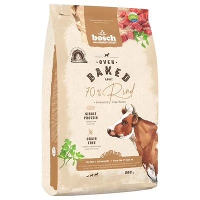 Das Hundefutter wird ohne Getreide hergestellt. Als gut verdauliche Kohlenhydratquelle sind hochwertige Kartoffeln enthalten. Seinen leckeren Fleischgeschmack erhält das Hundetrockenfutter durch die einzige tierische Proteinquelle – Rind. Der Anteil an frischem Rindfleisch beträgt stolze 62%. Abgerundet wird die feine Rezeptur durch ausgewählte, heimische „Superfoods“, zum Beispiel Petersilie und Rote Bete. Sie versorgen Ihren Liebling mit wichtigen Vitaminen, Mineralstoffen und Spurenelementen. Bosch HPC Oven Baked Rind wird auf besondere Weise hergestellt – der Name verrät es schon. Die Futterkroketten werden schonend im Ofen ausgebacken und erhalten dabei ihre unwiderstehlich krosse Konsistenz. Gleichzeitig bleiben die in den Zutaten enthaltenen Nährstoffe und ihr Geschmack bestmöglich erhalten.