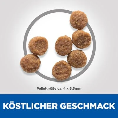 Das Hundefutter zeichnet sich durch ein optimales Nährstoffprofil mit einem ausgewogenen Mineralstoffgehalt aus. Das kann die Entwicklung starker Knochen und Zähne unterstützen. Hill’s Science Plan Puppy <1 Small & Mini mit Huhn enthält hochwertige Proteine, die den Aufbau von Muskelmasse unterstützen können, während das in Fischöl enthaltene DHA zu einer gesunden Entwicklung der Augen und der Gehirnfunktion beitragen kann. Zur Stärkung der Abwehrkräfte ist das Welpenfutter mit einer speziellen Antioxidantien-Verbindung angereichert. Die Pellets sind extra klein und somit ideal für Hundewelpen kleiner Rassen geeignet.