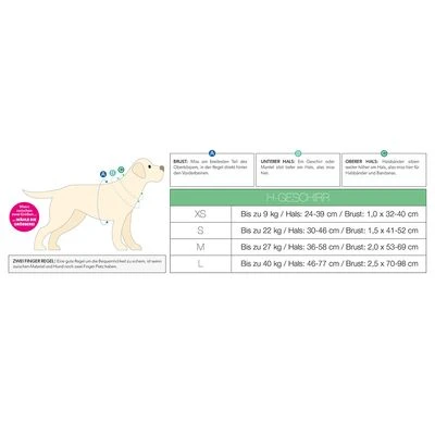 | Größe | Brustumfang | Halsumfang | Gurtbreite | Rückensteg | Bauchsteg | Gewicht des Hundes bis kg |