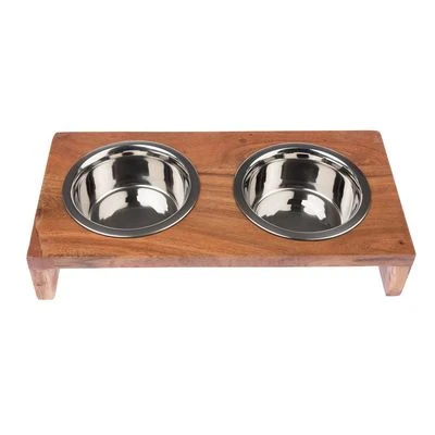 Exklusive Napfbar für Katzen & Hunde, aus echtem Mango-Holz, mit 2 herausnehmbaren Edelstahl-Näpfen, geräuscharmes Einsetzen dank Silikonring, auf rutschfesten Silikonfüßen, in zwei Größen erhältlich