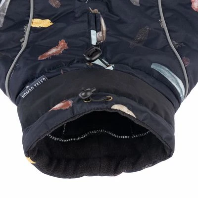 Hübscher Hundemantel mit buntem Feder-Print, wasserabweisend, weiche Innenseite aus Fleece, hoher Kragen, schnell anzuziehen dank Klickverschluss, reflektiert im Dunkeln, Farbe: mitternachtsblau