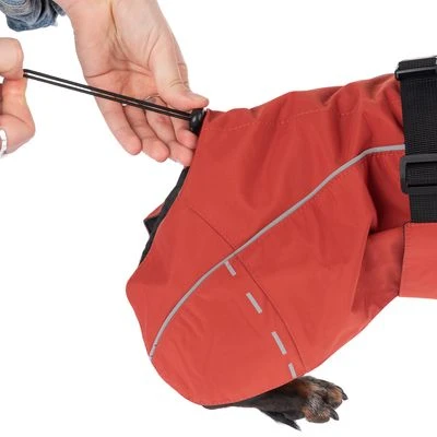 Der Regenmantel ist wasserabweisend und bietet deinem Hund somit optimalen Schutz vor Nässe. Er ist an mehreren Stellen anpassbar, um ihn perfekt auf die Größe deines Hundes einzustellen. Die elastischen Beinschlaufen sorgen dafür, dass der Mantel auch bei wilden Aktivitäten nicht verrutscht. Ein besonderes Highlight ist außerdem der großzügig geschnittene Brustlatz, der Schutz für Brust und Schultern bietet, da diese Bereiche besonders empfindlich sind.