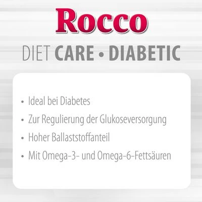 Das Diät-Alleinfutter wurde für die besonderen Bedürfnisse von Hunden entwickelt, die an Diabetes erkrankt sind. Dabei ist eine Ernährung wichtig, die Schwankungen im Blutzuckerspiegel reduzieren und dadurch die Glucoseversorgung regulieren kann. Rocco Diet Care Diabetic enthält daher einen hohen Rohfaseranteil, der diese Schwankungen ausgleichen kann.