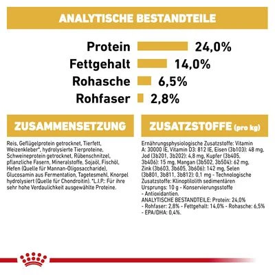 Die englische Bulldogge ist ein ruhiger, ausgeglichener Familienhund und Begleiter mit einem Herz aus Gold. Er zeichnet sich durch seine spezielle Kopfform mit kurzem Gesichtsteil und Unterbiss (brachzephaler Typ) aus, die Haut hat zahlreiche Falten und durch seine Körperstatur kann die Bulldogge zu empfindlichen Gelenken neigen. Ein besonderer Hund, der ein besonderes Futter benötigt. Royal Canin Breed Bulldogge Adult wird diesen Ernährungsanforderungen ausgewachsener Bulldoggen ab 12 Monate gerecht. Alle Royal Canin Produkte durchlaufen eine umfassende Qualitätskontrolle, um eine optimale Futterqualität zu gewährleisten.
