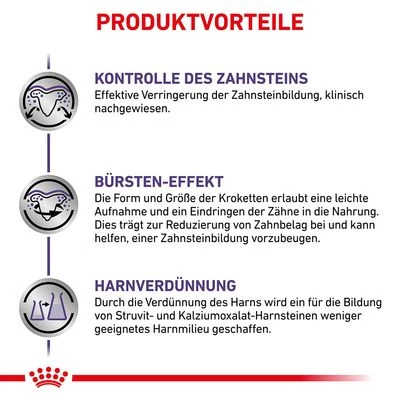 Die spezielle Form und Größe der Kroketten fördert bei der Futteraufnahme einen Bürsteneffekt, der dabei helfen kann, Plaque und Zahnstein zu reduzieren und die Bildung von neuem Zahnstein zu verringern. Dank eines sorgsam angepassten Mineralstoffgehalts kann Royal Canin Expert Dental Small Dogs Trockenfutter für Hunde zudem zu einem optimalen Harnmilieu beitragen.