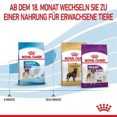 Welpen sehr großer Rassen benötigen in etwa 18-24 Monate, um ihr Erwachsenengewicht von 45+ kg zu erreichen. Während dieser Zeit ändern sich ihre Ernährungsbedürfnisse, weshalb Royal Canin zwei Futtersorten entwickelt hat: Royal Canin Giant Puppy, das zwischen 2 und 8 Monaten gefüttert wird, und diese Formulierung – Royal Canin Giant Junior – für den Zeitraum von 8 bis 18/24 Monaten.