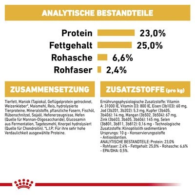 Royal Canin Breed Great Dane Adult ist mit einer Rezeptur ausgestattet, die speziell für Ihre Deutsche Dogge konzipiert wurde. Es versorgt Ihren Hund mit einer hohen Energiedichte, um den großen Bedarf Ihres Riesen zu decken. Die hochverdaulichen Zutaten können zudem dazu beitragen, eine optimale Verdauungssicherheit sowie eine gute Stuhlqualität zu gewährleisten. Weitere exklusive Nährstoffe, wie Glukosamin und Chondroitin, können zudem einen starken Knochenbau und gesunde Gelenke begünstigen.