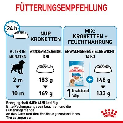 - Trockenfutter für mittelgroße Welpen (Erwachsenengewicht: 11-25 kg) im Alter zwischen 2 und 12 Monaten
