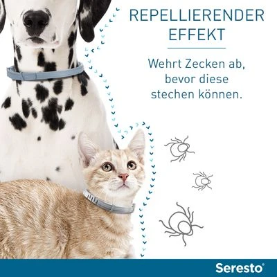 Seresto® 1,25 g + 0,56 g Halsband für Hunde ≤ 8 kg, Seresto® 4,50 g + 2,03 g Halsband für Hunde > 8 kg. Anwendungsgebiete: Zur Vorbeugung (Ctenocephalides felis, C. canis) und Behandlung von Flohbefall (Ctenocephalides felis) mit einer Wirkungsdauer von 7 bis 8 Monaten. Die Wirksamkeit gegen Flöhe beginnt sofort nach dem Anlegen des Halsbandes. Das Tierarzneimittel verhindert die Entwicklung von Flohlarven in der unmittelbaren Umgebung des Tieres für 8 Monate. Seresto kann als Teil der Behandlungsstrategie bei durch Flohstiche ausgelöster allergischer Hautentzündung (Flohallergiedermatitis, FAD) angewendet werden. Das Tierarzneimittel hat eine anhaltend akarizide (abtötende) Wirkung bei Zeckenbefall mit Ixodes ricinus, Rhipicephalus sanguineus, Dermacentor reticulatus, sowie repellierende (anti-feeding = die Blutmahlzeit verhindernde) Wirkung bei Zeckenbefall mit Ixodes ricinus und Rhipicephalus sanguineus mit einer Wirkungsdauer von 8 Monaten. Das Tierarzneimittel ist wirksam gegen Larven, Nymphen und adulte Zecken. Es ist möglich, dass Zecken, die zum Zeitpunkt der Behandlung bereits am Hund vorhanden sind, nicht innerhalb der ersten 48 Stunden nach Anlegen des Halsbandes getötet werden und angeheftet und sichtbar bleiben. Deshalb sollten die Zecken, die zum Behandlungszeitpunkt bereits auf dem Hund befindlich sind, entfernt werden. Der Schutz vor dem Befall mit neuen Zecken beginnt innerhalb von zwei Tagen nach Anlegen des Halsbandes. Das Produkt vermittelt indirekten Schutz gegen eine Übertragung der Erreger Babesia canis vogeli und Ehrlichia canis durch die Vektorzecke Rhipicephalus sanguineus. Dadurch wird das Risiko einer Babesiose und einer Ehrlichiose des Hundes über einen Zeitraum von sieben Monaten reduziert. Zur Behandlung gegen Haarlingsbefall (Trichodectes canis). Zu Risiken und Nebenwirkungen lesen Sie die Packungsbeilage und fragen Sie Ihren Tierarzt oder Apotheker. Apothekenpflichtig. Zulassungsinhaber: Bayer Vital GmbH, 51368 Leverkusen. Druckversion: 12/2016