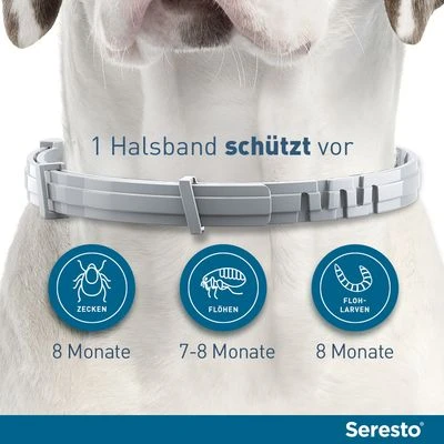 - Halsband 70 cm: Seresto 4,50 g + 2,03 g Halsband für Hunde > 8 kg. Zur Behandlung (Ctenocephalides felis) und Vorbeugung (Ctenocephalides felis, C. canis) eines Flohbefalls.