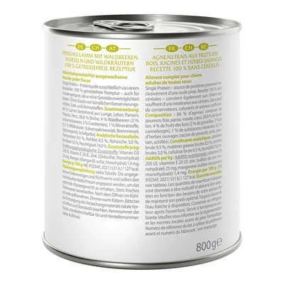 Getreidefreies Premium-Nassfutter, Single Protein, das sich an der Ernährung des Wolfes orientiert. Frischfleisch & Innereien kombiniert mit Waldbeeren, Wurzeln und Wildkräutern.